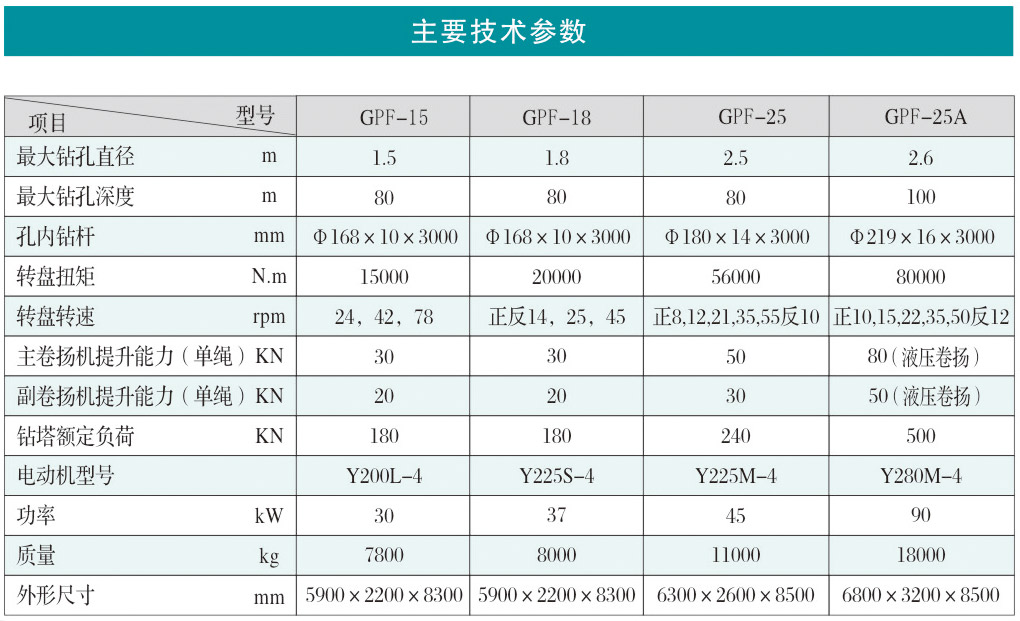 GPF型系列工程鉆機是一種可滿足正、反循環(huán)鉆進工藝要求的大口徑轉(zhuǎn)盤式鉆孔設(shè)備。主要用于橋粱、港口、高層建筑、水壩等基礎(chǔ)工程大口徑灌注樁施,還可鉆鑿水井及其它工程孔。
